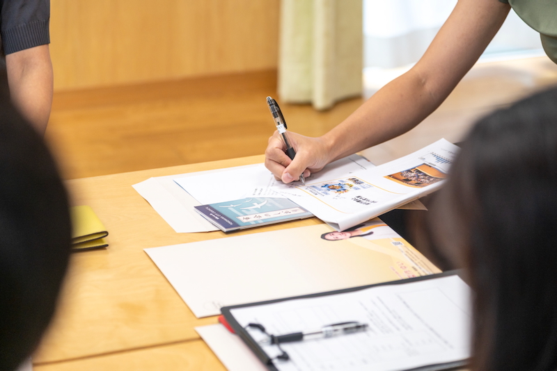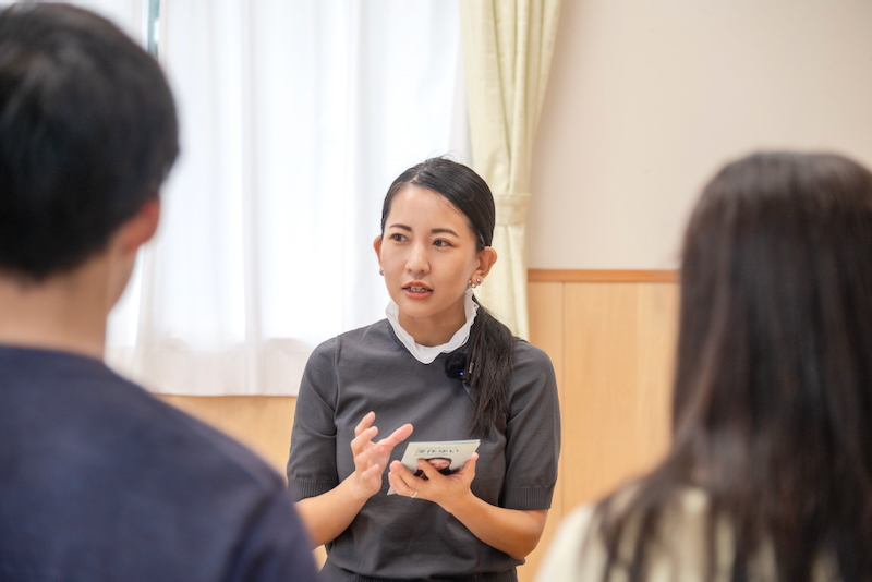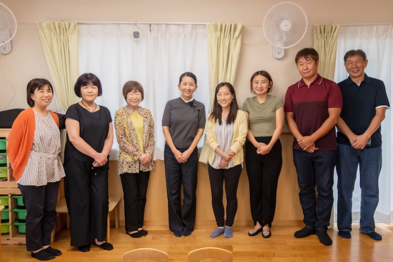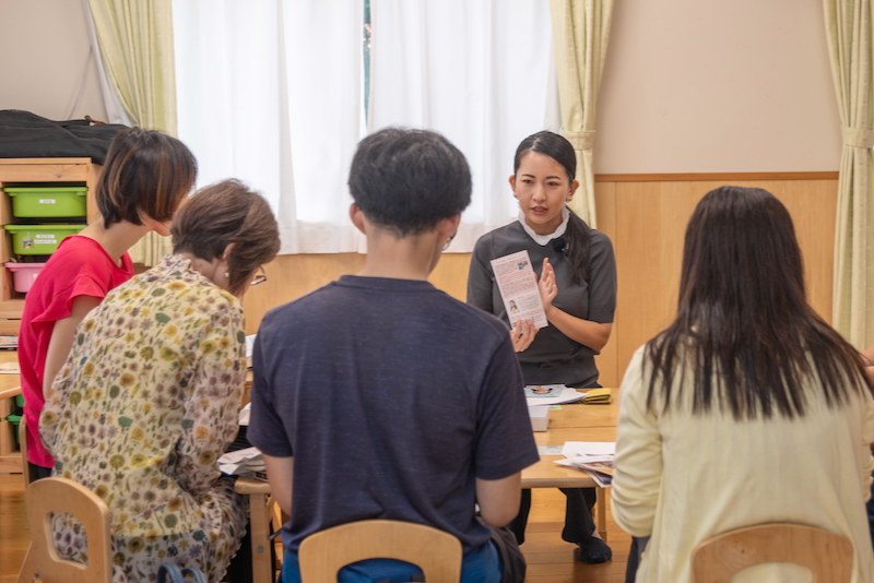 園児さんの小さな机を囲んで、園児さんの小さな椅子に輪になって座り、アットホームで和やかな雰囲気の中、進行することができました。