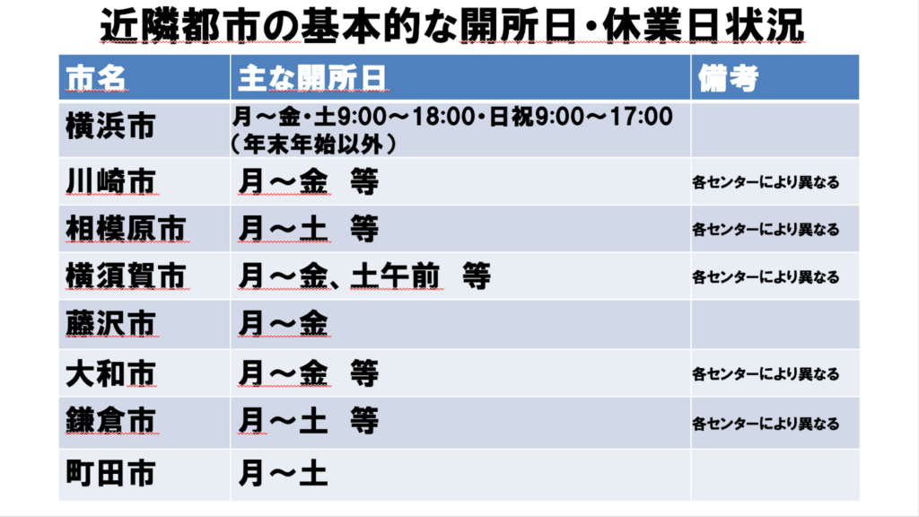 本市以外の多くの自治体では、日曜・祝日が休みであり実際に、